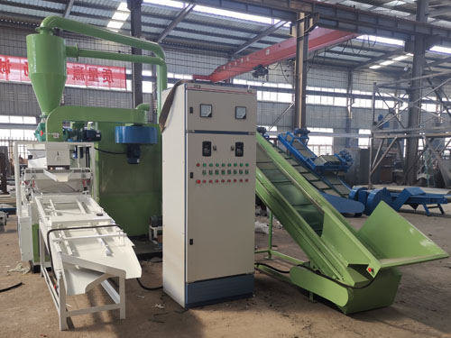 銅線破碎分離機(jī)又稱銅米機(jī)是分離廢舊電線電纜的一體式干式生產(chǎn)線。可以加工的原料包括:廢舊汽車電路線,通訊電纜線,廢舊雜料電線,毛絲細(xì)線等。此機(jī)器尤其適合加工細(xì)小的電線。結(jié)構(gòu)新型,產(chǎn)量大,耗電少,分選率高,一次投料,多機(jī)協(xié)作完成,全綫由PLC控制。